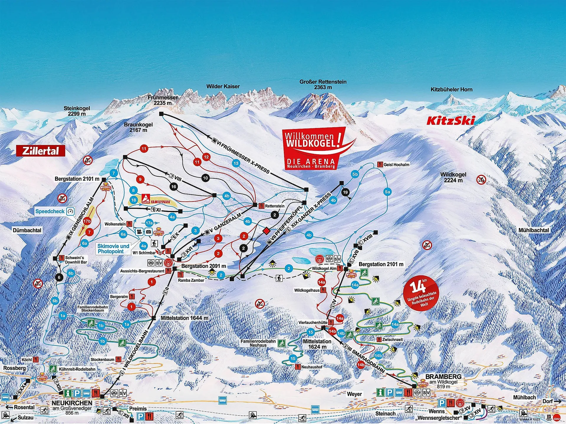 The use of the latest (computer) technologies in particular enables a wide range of variations in digital panorama painting. Whether mountains, forests, lakes, cable cars, pistes, fun parks, cross-country ski trails, toboggan runs, hiking trails, bike routes or downhill routes, whether classic in premium style or trendy in comic style: with the entire range of traditional to state-of-the-art panorama painting techniques, there are virtually no limits to individual custom designs.
